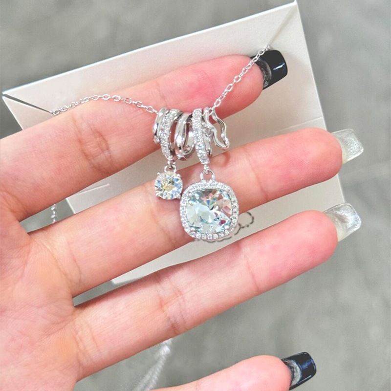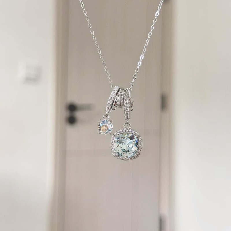 S925 Pure Silver Ice-clear Sea Blue Square Zircon Necklace